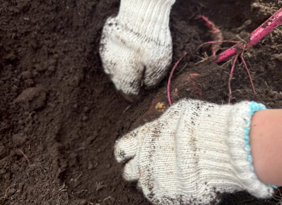 掘るときは、つるの周りを手でほぐすように、ゆっくり慎重に掘り進めるのがおすすめです。